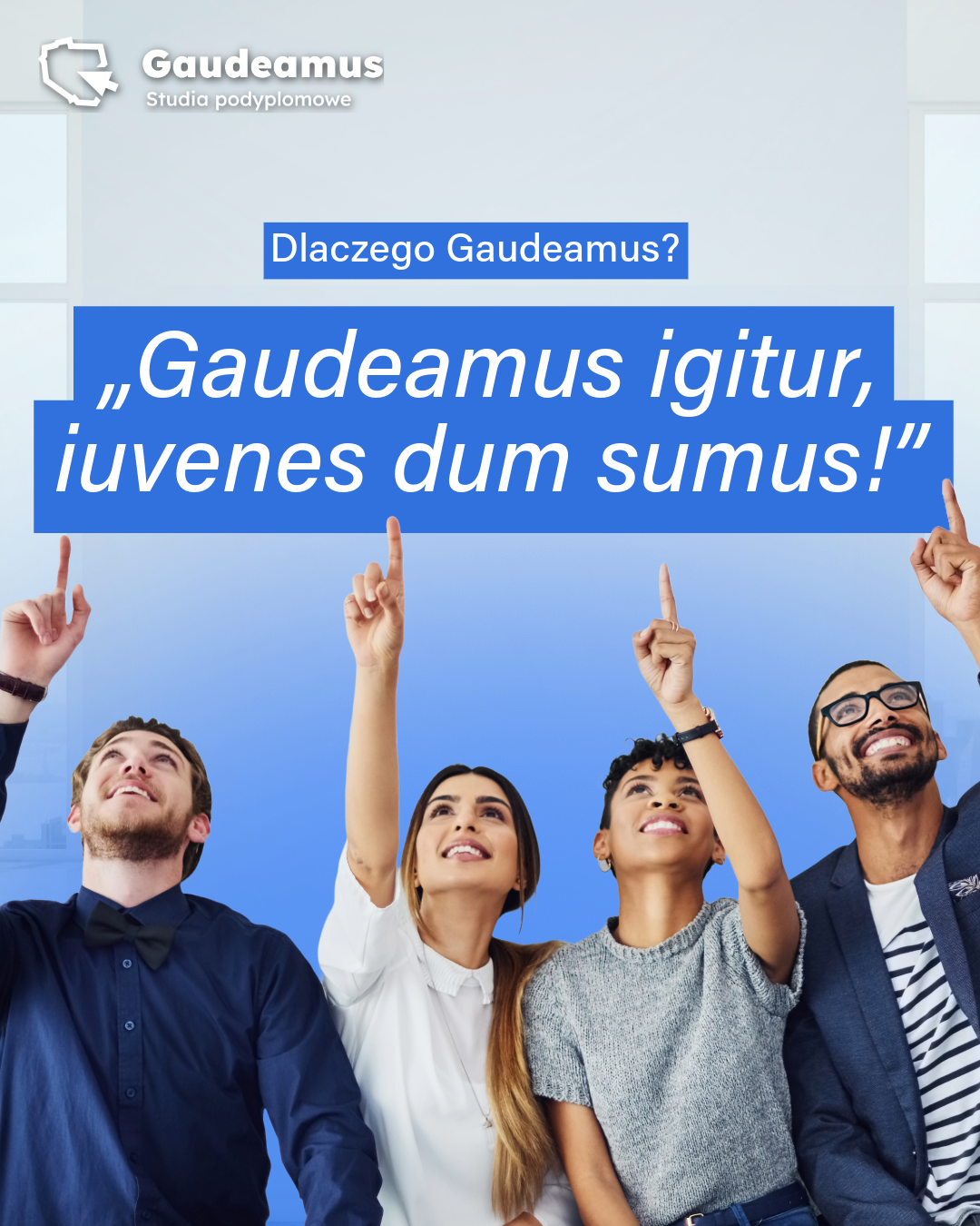"Gaudeamus Igitur" - Radujmy się więc! Pieśń ta sięga swoją historią czasów średniowiecza i nierozłącznie towarzyszy studentom przy ważnych wydarzeniach akademickich. Podążając z duchem tradycji w Gaudeamus wierzymy, że warto cieszyć się życiem. Dlatego nie ograniczamy słuchaczy do stacjonarnych zjazdów. Studiuj z nami z dowolnego miejsca na świecie!